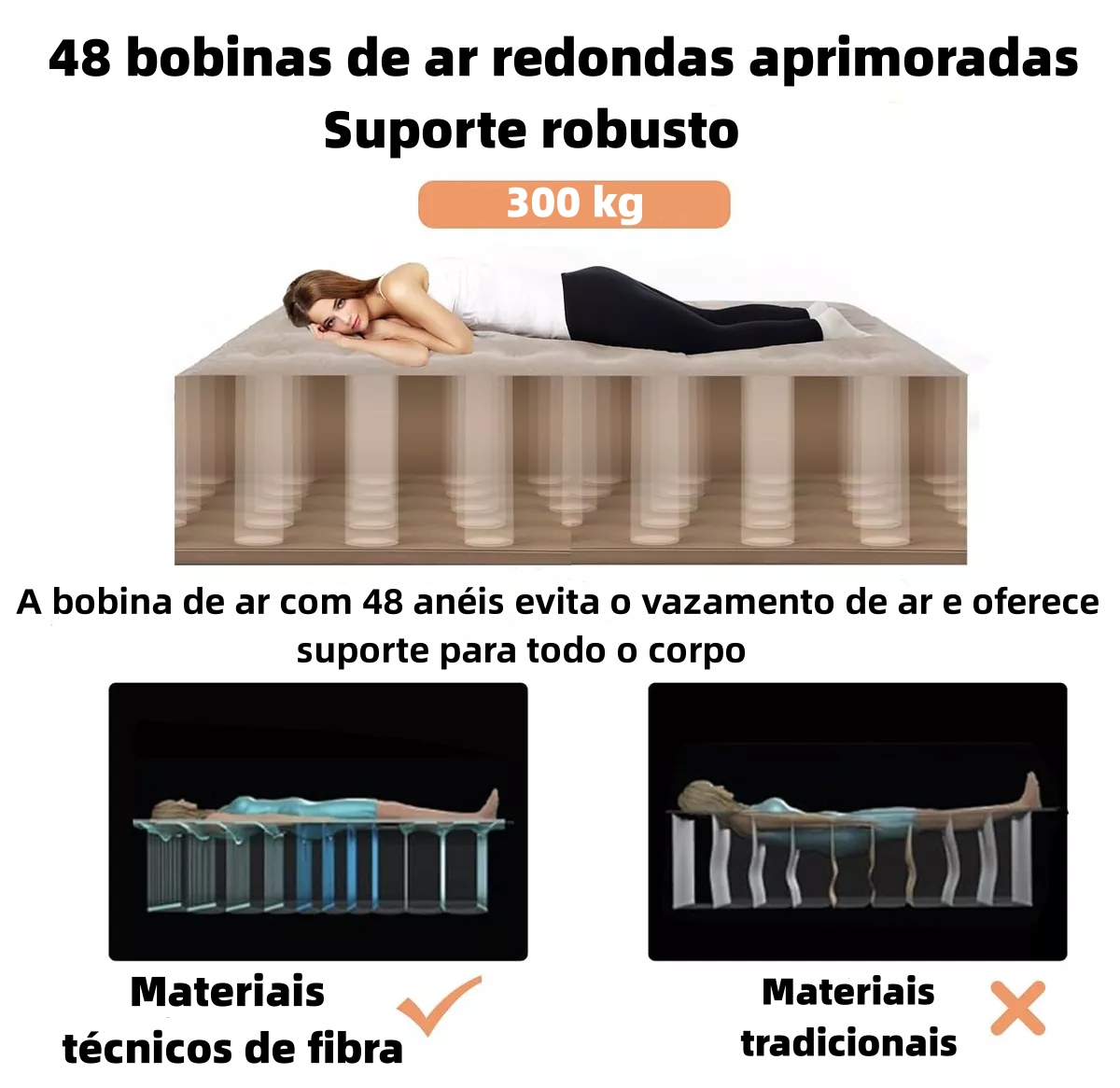 CONSTRUÇÃO SUPERIOR: as molas a gás estruturais proporcionam suporte e durabilidade máximos, enquanto o design ergonômico garante uma noite de sono confortável. Nosso colchão de ar queen size tem 48 bobinas de ar estruturais que oferecem suporte da cabeça aos pés para um sono relaxante e confortável. Suporta até 300 kg